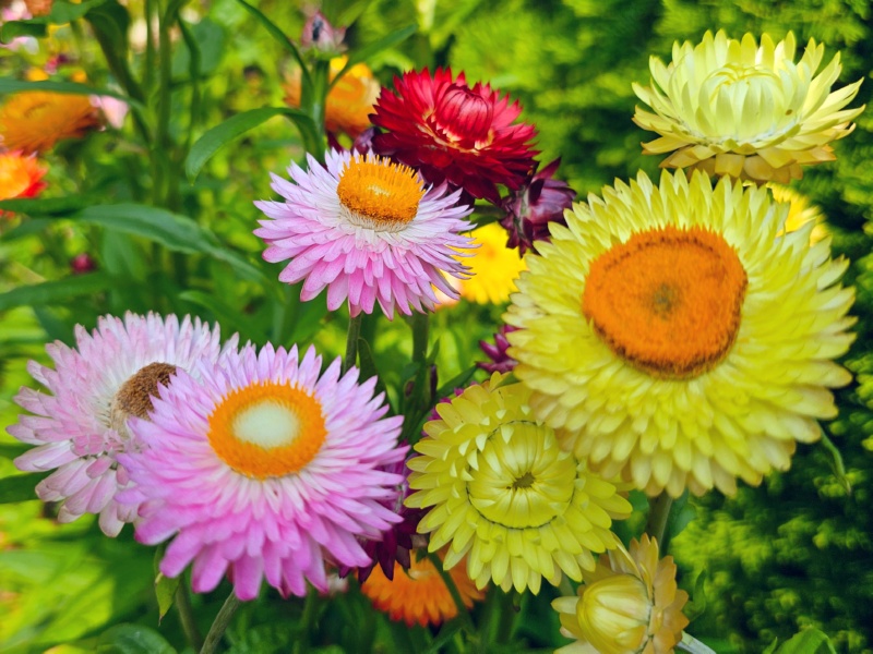Anzucht & Pflege: Die Pflege ist recht simpel, die Pflanze ist sehr genügsam. Ab ca. 50 cm Wuchshöhe sollte man unterstützen und an binden. Als Standort liebt sie einen sonnigen, wenn möglich windgeschützten Standort, Halbschatten verträgt sie allerdings auch ohne Probleme. Auch mit trockenen Phasen kommt sie gut zurecht. Am besten erntet man Strohblumenblüten für Trockensträuße kurz bevor sich die Blüten komplett öffnen, also die ersten Blütenblätter sich zur Seite neigen. Strohblumen bevorzugen einen durchlässigen Boden an einem warmen und vollsonnigen Standort. Vorzucht ab Ende März im Gewächshaus oder auf der Fensterbank, Direktsaat ab Ende April, Vorzucht ist zu bevorzugen. Anfangs leicht kühlere Tage sind gut für das Keimverhalten. Regelmäßiges moderates Nachdüngen erhöht die Blühfreudigkeit. Gute Kübelpflanze.