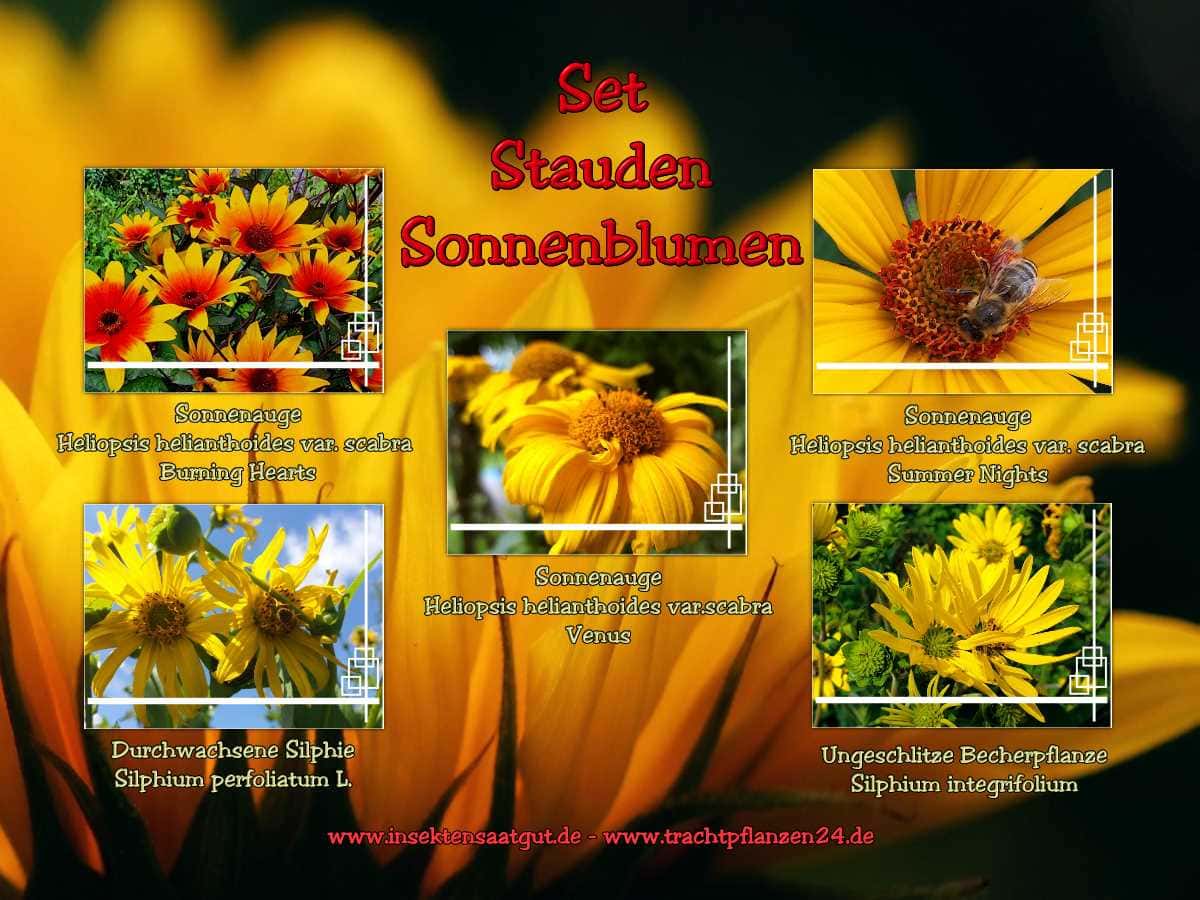 Stauden Sonnenblumen sind mehrjährige und winterharte Trachtstauden mit massig Pollen und Nektar für viele Insekten. Diese Massenblüher ziehen massig Insekten an und man findet immer wieder Tiere auf den Blüten die man teilweise nur sehr selten antrifft. Diese Pflanzen tragen eindeutig zur Artenvielfalt bei. Alle in diesem Konvolut beinhalteten Stauden sind leicht in der Anzucht und Pflege und auch für Anfänger geeignet. Die einzelnen Anzucht- und Pflegehinweise können Sie bei Pflanzenbeschreibungen nachlesen.